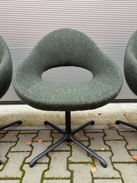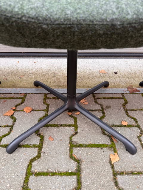 OverzichtArtifort Shark eetkamerstoelen in de kleur groen/grijs met de kleur RAL 7021 zwart/grijze draaibare kruispoot onderstellen, met terugdraai mechanisme!