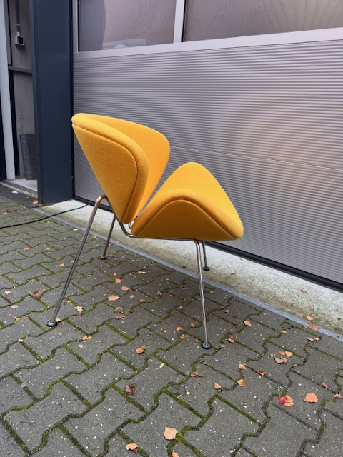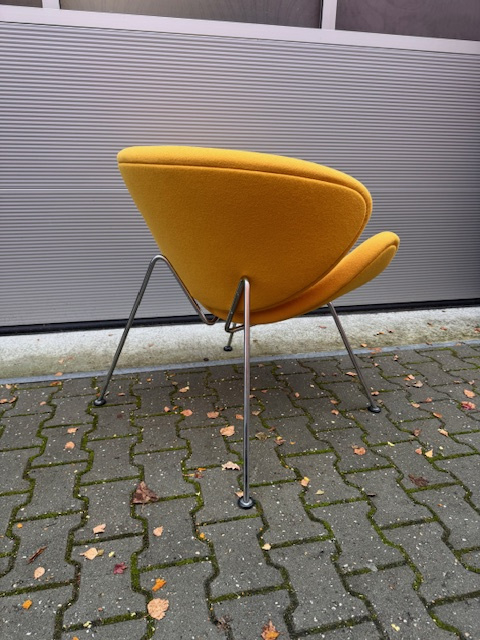 De Artifort Orange Slice fauteuil, ontworpen door Pierre Paulin in 1960, is een iconisch meubelstuk dat bekend staat om zijn speelse, tijdloze design. De fauteuil bestaat uit twee gebogen, schelpvormige kussens die samen een organische, uitnodigende vorm creëren. Door de positie van de kussens lijkt de stoel vanuit elke hoek op een schijf van een sinaasappel, vandaar de naam “Orange Slice”.