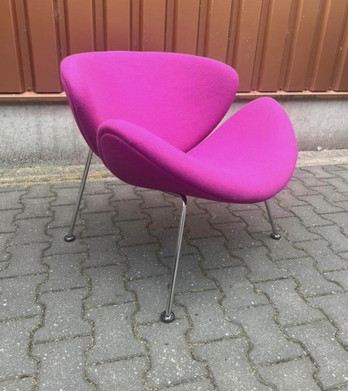 De Artifort Orange Slice fauteuil, ontworpen door Pierre Paulin in 1960, is een iconisch meubelstuk dat bekend staat om zijn speelse, tijdloze design. De fauteuil bestaat uit twee gebogen, schelpvormige kussens die samen een organische, uitnodigende vorm creëren. Door de positie van de kussens lijkt de stoel vanuit elke hoek op een schijf van een sinaasappel, vandaar de naam “Orange Slice”.